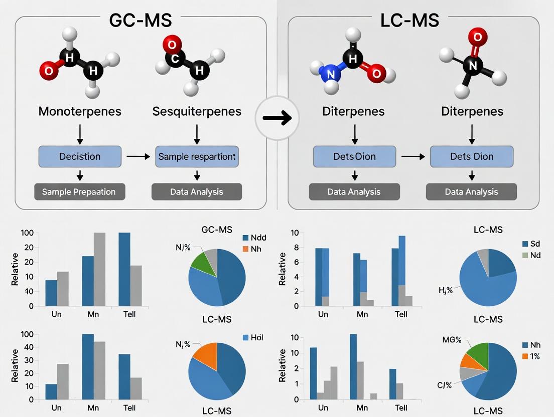The choice between GC-MS and LC-MS is not a matter of superiority, but of strategic alignment with the physicochemical properties of the target natural products and the research objectives. GC-MS remains the gold standard for volatile and thermally stable compounds (e.g., mono-/sesquiterpenes), offering superb library matchability and robust quantification. LC-MS, conversely, is indispensable for thermolabile, polar, and high-molecular-weight compounds (e.g., glycosides, peptides), providing unparalleled flexibility and sensitivity for complex biological matrices. Future directions point toward increased integration of these platforms, leveraging LC for prefractionation and GC-MS for definitive identification, and the growing adoption of high-resolution and tandem MS for structural elucidation. For biomedical research, this synergy accelerates drug discovery from natural sources, enabling comprehensive metabolomic profiling, precise biomarker validation, and the development of robust quality control methods for herbal medicines and nutraceuticals, ultimately bridging traditional knowledge with modern analytical rigor.
